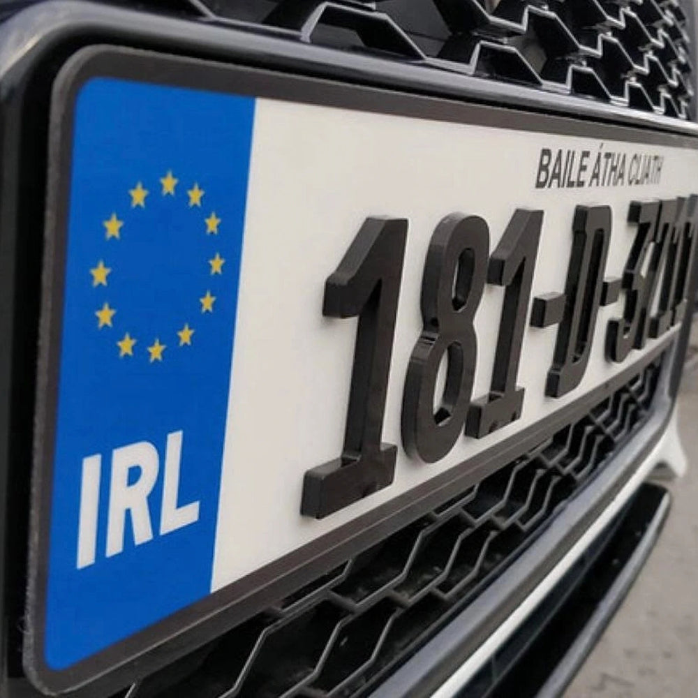 These plates meet all Irish standards for font, spacing, dash placement, reflectivity, and include the Blue EU IRL badge and County name in Irish.
